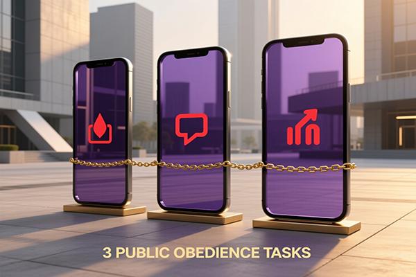 You will be assigned one public humiliation task designed to test your obedience and submission. Whether it involves following specific instruction...